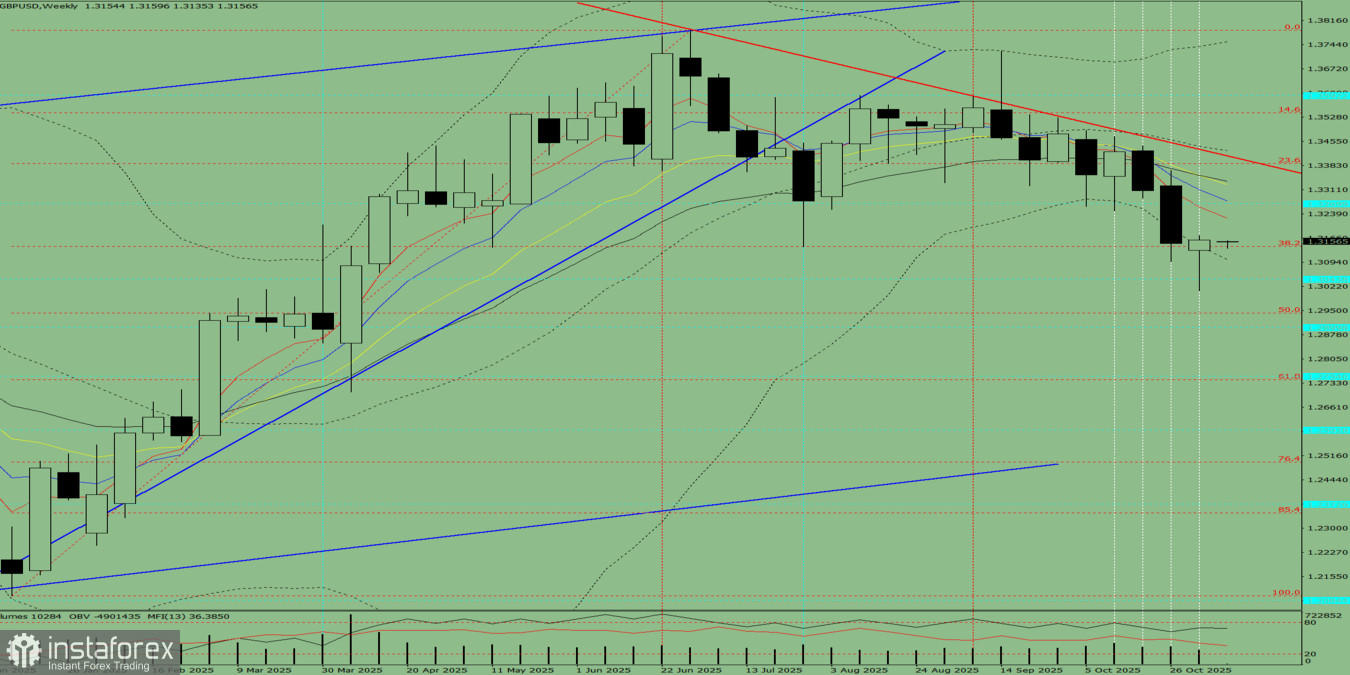 10.11.2025 10:16 AMAnalyse des tendancesCette semaine, le prix — en partant de 1.3160 (le prix de clôture de la dernière bougie hebdomadaire) — peut continuer son mouvement à la baisse vers 1.2942, ce qui correspond au niveau de retracement de 50 % (ligne pointillée rouge). Après avoir testé ce niveau, le prix peut rebondir vers 1.3044, un niveau de support historique (ligne pointillée bleu clair).