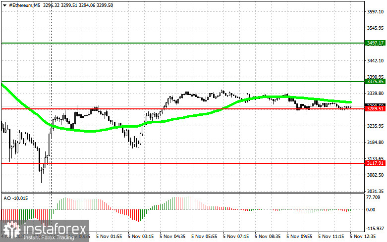 Сценарий №2: покупать эфир можно от нижней границы $3289 при отсутствии рыночной реакции на ее пробой в обратную сторону к уровням $3375 и $3497.
