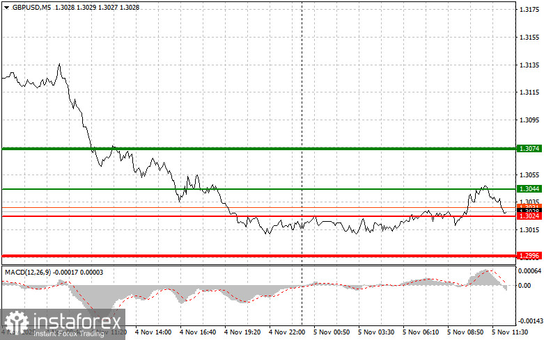 Сценарий №2: покупать фунт сегодня также планирую в случае двух подряд тестов цены 1.3024 в момент, когда индикатор MACD будет находиться в области перепроданности. Это ограничит нисходящий потенциал пары и приведет к обратному развороту рынка вверх. Можно ожидать рост к противоположным уровням 1.3044 и 1.3074.