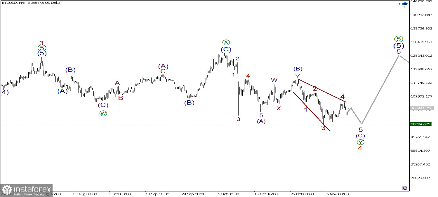 12.11.2025 18:52Предполагается, что по криптовалютной паре BTC/USD в глобальной перспективе может формироваться крупный бычий импульс 1-2-3-4-5. Большая часть указанной фигуры полностью завершена. На текущем графике представлена разметка боковой коррекции 4, которая может принять форму волновой плоскости [A]-[B]-[C].