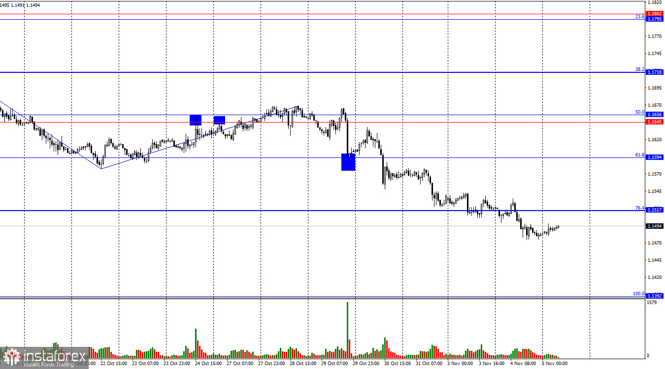 Ситуация с волнами на часовом графике остается простой и понятной. Последняя завершенная волна вверх не пробила пик предыдущей волны, а последняя волна вниз пробила предыдущий лоу. Таким образом, в данное время тренд вновь поменялся на «медвежий». Трейдеры-быки в очередной раз не сумели воспользоваться предоставленными возможностями для наступления, а медведи атакуют зачастую на голом энтузиазме, не имея информационной поддержки.