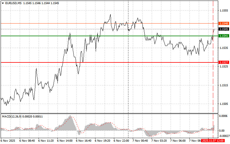 Тест цены 1.1541 пришелся на момент, когда индикатор MACD много прошел вверх от нулевой отметки, что ограничивало восходящий потенциал пары. По этой причине я не покупал евро и остался без сделок.