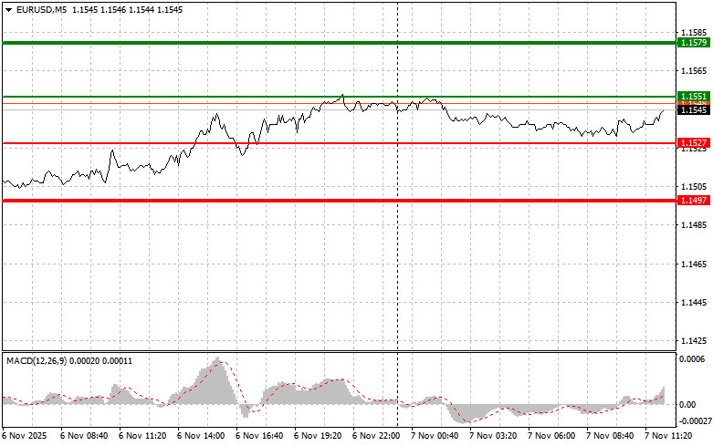 Сценарий №2: покупать евро сегодня также собираюсь в случае двух подряд тестов цены 1.1527 в момент, когда индикатор MACD будет находиться в области перепроданности. Это ограничит нисходящий потенциал пары и приведет к обратному развороту рынка вверх. Можно ожидать рост к противоположным уровням 1.1551 и 1.1579.