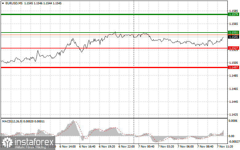 Сценарий №2: продавать евро сегодня также собираюсь в случае двух подряд тестов цены 1.1551 в момент, когда индикатор MACD будет находиться в области перекупленности. Это ограничит восходящий потенциал пары и приведет к обратному развороту рынка вниз. Можно ожидать снижения к противоположному уровню 1.1527 и 1.1497.