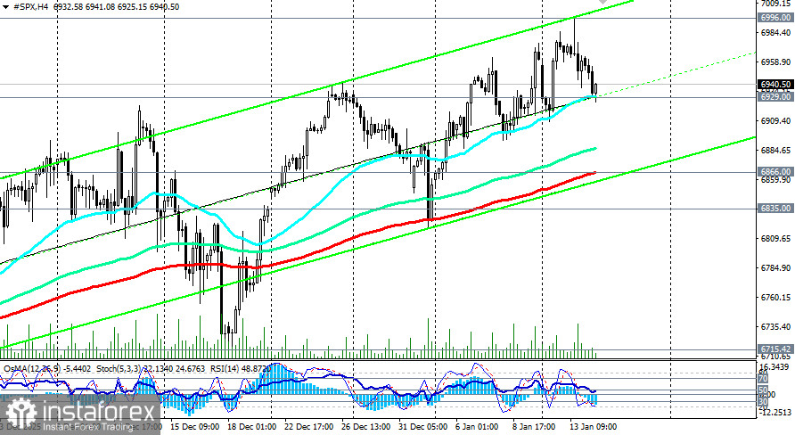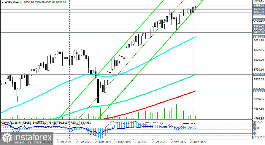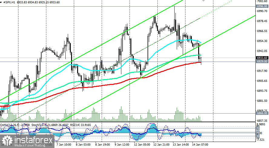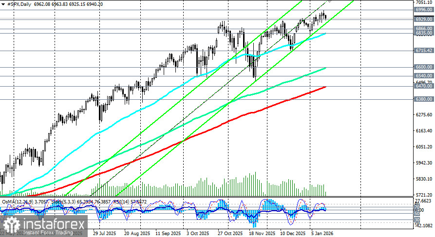 Основой сценарий (Buy «по рынку», Buy Stop 6935.00. Stop-Loss 6890.00. Цели 6900.00, 6960.00, 7000.00, 7100.00, 7200.00, 8000.00), предложенный нами в предыдущем обзоре «S&P500: сценарии динамики на 08.01.2026», оправдал себя. Цена достигла ближайшей цели 6960.00 и вплотную приблизилась к отметке 7000.00, сохраняя потенциал для дальнейшего роста.