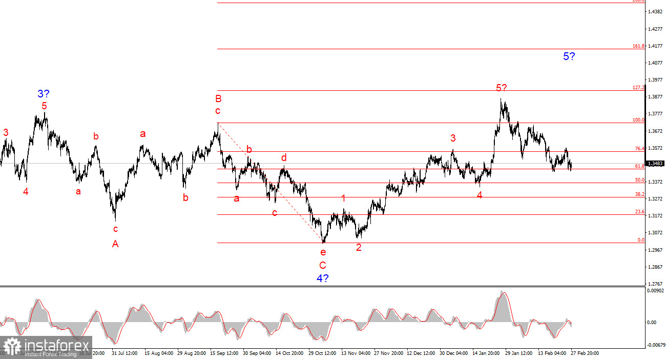 Следовательно, я могу сделать вывод, что текущее падение инструмента связано исключительно с новостным фоном и настроением самого рынка, потому что многие экономические данные из Америки должны были создать проблемы доллару, а не поддержать его. Например, отчеты по инфляции, ВВП и рынку труда. Исходя из этого, спрос на валюту США может повышаться на будущей неделе, так как вряд ли военные действия на Ближнем Востоке завершаться также быстро, как в Венесуэле. Трамп же, тем временем, уже сообщил о возможном «дружественном захвате» Кубы... Если события и дальше будут развиваться в этом направлении, коррекционная структура преобразуются в пятиволновую, а после этого речь уже будет идти о трансформации всей волновой разметки.